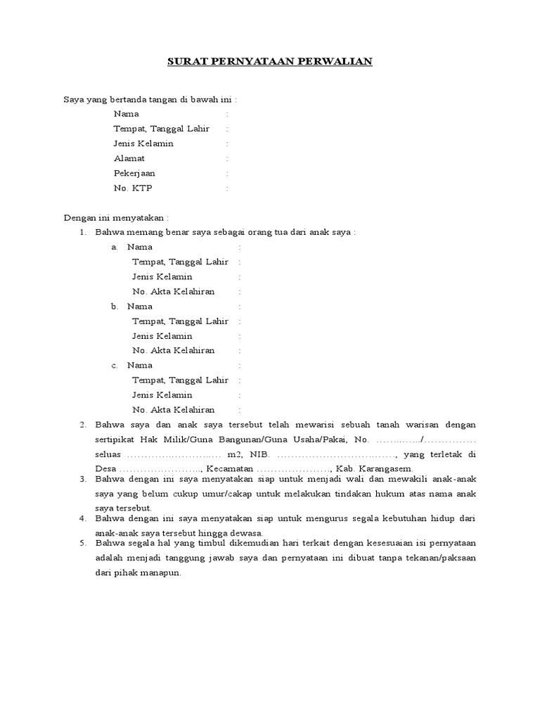 By indra | jul 1, 2020 | hukum acara perdata | 0 comments. Yang bertanda tangan dibawah ini :. Demikian surat pernyataan perwalian ini saya buat dengan sebenarnya, dan untuk dapat. Sebagaimana halnya gugatan, permohonan juga . Bahwa maksud dan tujuan pemohon mengajukan permohonan perwalian ini adalah untuk mengurus.